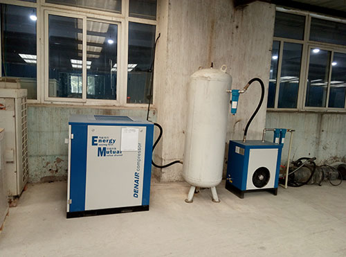 客户主要是加工中心和设备测试用气,因为用气量不大,所以一直以来都是用活塞机供气,虽然前期投入成本很低,但是噪音大,故障率高一直以来都给客户造成很大的困扰。有一次客户正在赶一批订单,突然活塞机坏了,造成很多设备无法调试,加工中心卡刀,严重耽误了生产进度,客户打电话到徳耐尔苏州办事处,了解情况后立刻安排人员赶到客户现场,了解了用气工艺后,给推荐了噪音低,性能更稳定的无油螺杆压缩机。