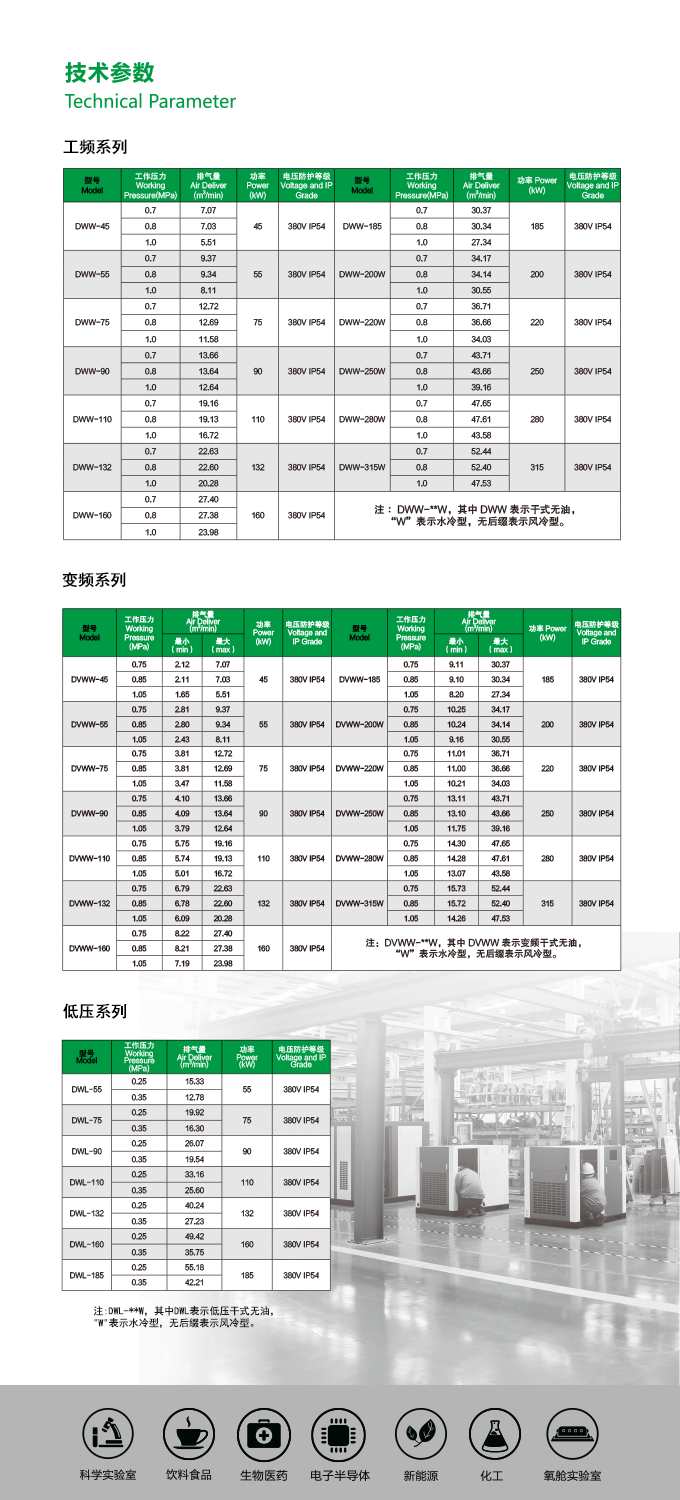 德耐尔为纺织、喷涂、水泥、玻璃、水处理、建材、食品加工、电子等行业专门打造的0.3Mpa/0.5Mpa低压节能螺杆空气压缩机系列。